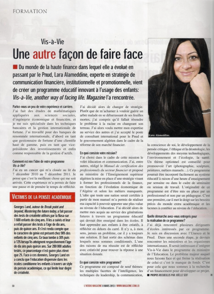L’Hebdo Magazine de mars 2013 “Vis-à-Vie Une autre façon de faire”